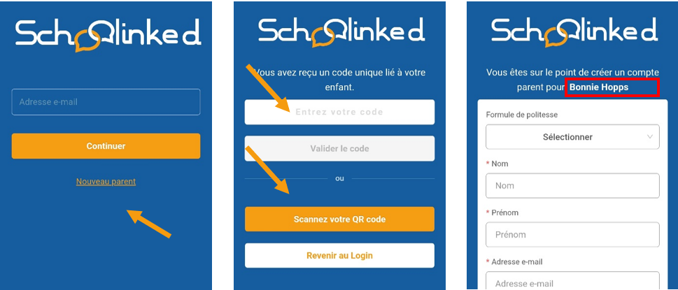 Un autre parent peut également créer son compte en suivant les instructions ci-dessus et utiliser le(s) même(s) QR-code(s) ou code de l’enfant.